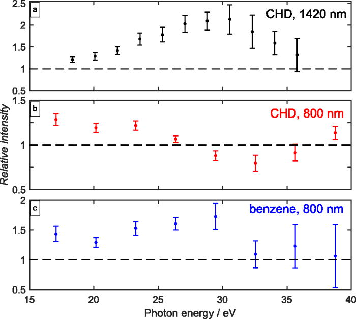 Рисунок 2. Соотношение интенсивностей (выровненных к антивыровненным) (a) молекул CHD, зондированных с 1420 нм, (b) CHD, зондированных с 800 нм, и (c) бензола, зондированного с 800 нм (синий). Полосы ошибок указывают на одно стандартное отклонение по измеренным сигналам. Источник: Structural Dynamics