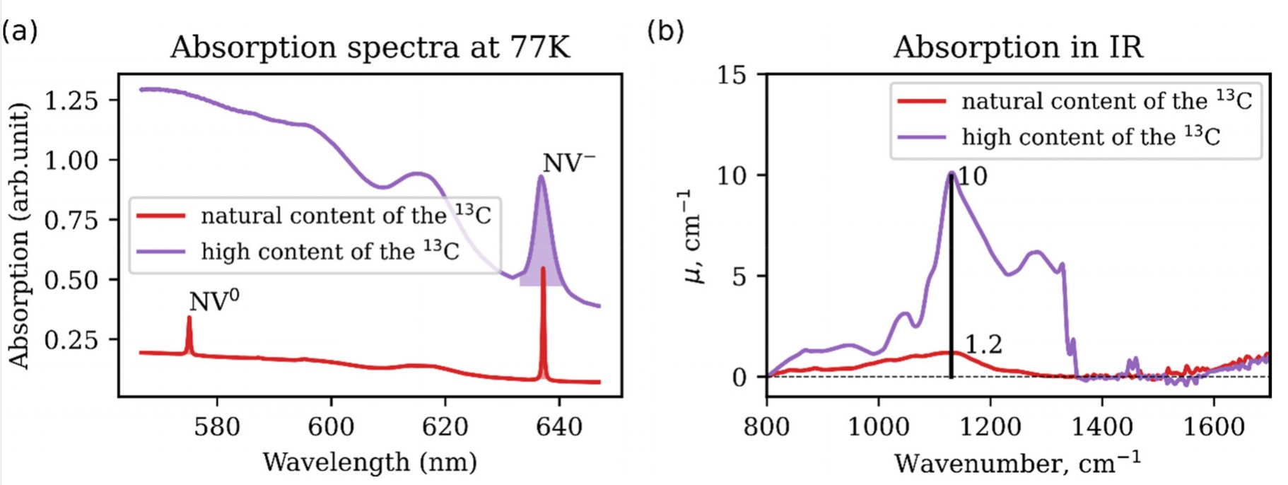 Рисунок 1. Спектры поглощения при температуре 77 K (а) в видимом диапазоне длин волн при температуре 77 K, (b) в инфракрасном диапазоне при комнатной температуре. Красным цветом обозначен график для образца с естественным содержанием углерода-13, фиолетовым цветом — для образца с высоким содержанием изотопа углерода-13. Источник: AVS Quantum Science