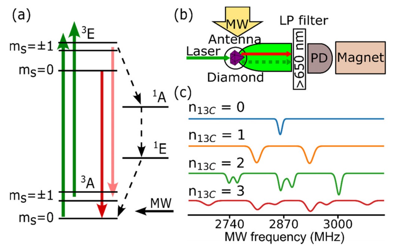 Рисунок 2. (а) энергетические уровни центра NV в магинтном поле, (b) экспериментальная установка, (c) ODMR-эффект для разных количеств ближайших атомов углерода-13. Источник: AVS Quantum Science