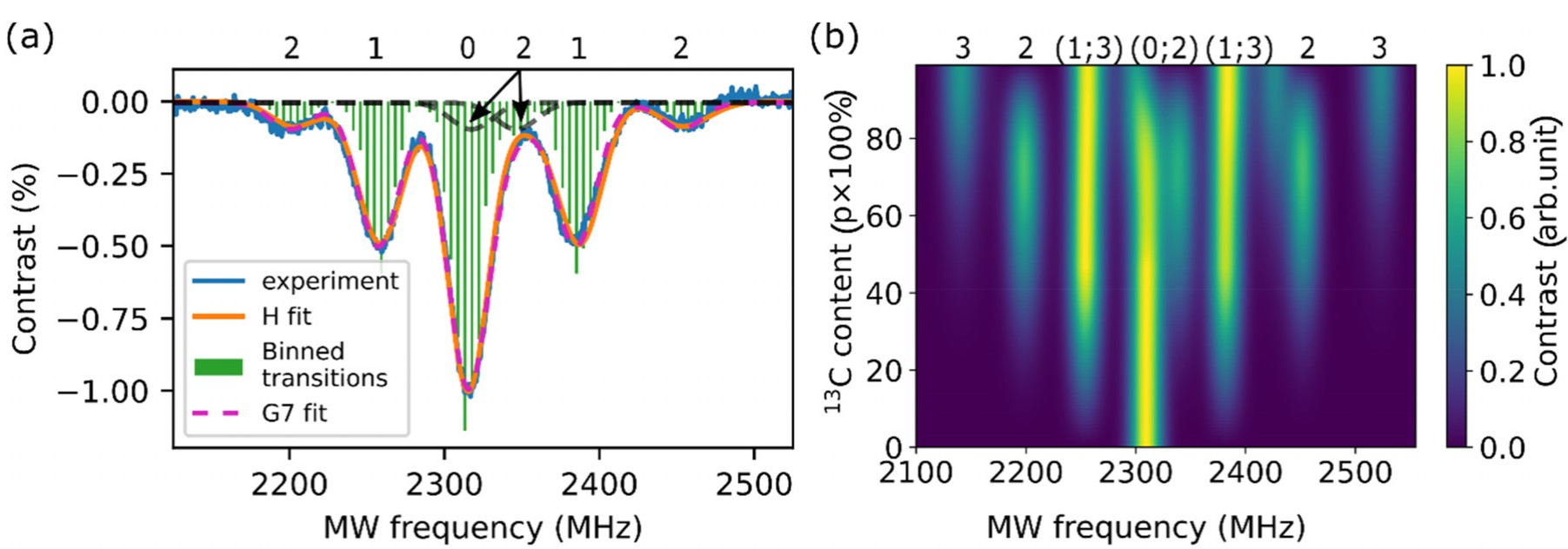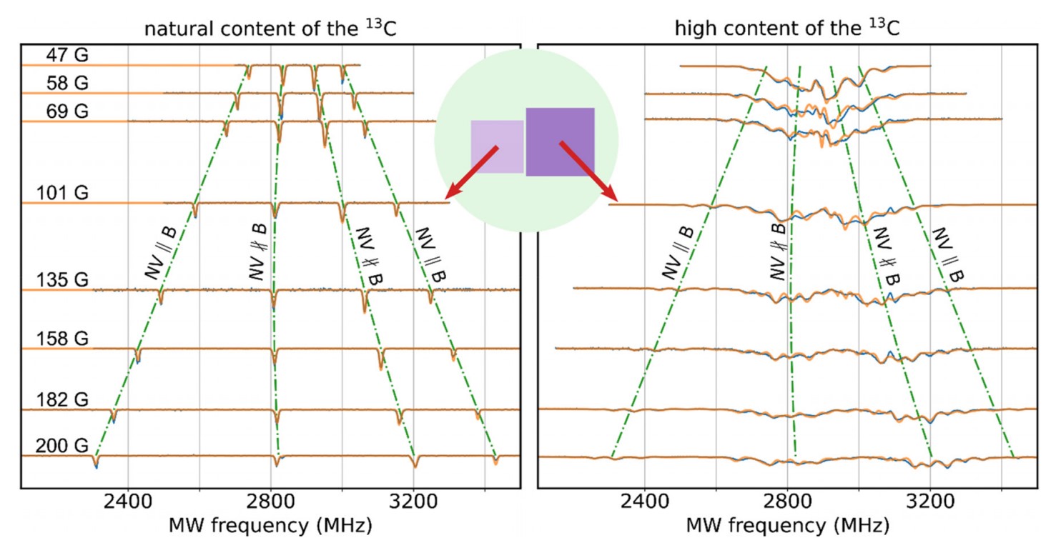 Основная идея, лежащая в основе измерений концентрации углерода-13, заключается как раз в расщеплении линий оптически детектируемых магнитных резонансов из-за взаимодействия центров окраски с близлежащими атомами изотопа углерода 13C. Чем выше концентрация углерода-13, тем выше вероятность обнаружить рядом с NV-центром атомы углерода-13 и тем более выраженным становится эффект расщепления линий спектра. Характер расщепления говорит о том, сколько атомов находится рядом с конкретным NV-центром, а статистика по многим NV-центрам определяет концентрацию изотопов в образце.