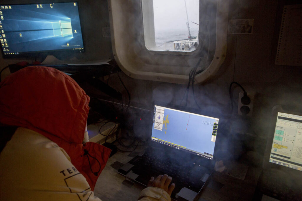 На карте точки наших недавних остановок образуют крест. Это из-за измерений мезомасштабного вихря, который наши физики засекли спутниковым снимкам. Они вычислили скорость его перемещения и мы скорректировали маршрут так, чтобы собрать побольше данных. «Есть крупные течения, определяющие условия в океане на больших масштабах пространства и времени, — замечает начальник отряда Алексей Зимин, — а есть маленькие вредные вихри — неучтённый перенос тепла! Они могут, например, ускорить таяние ледяного покрова».