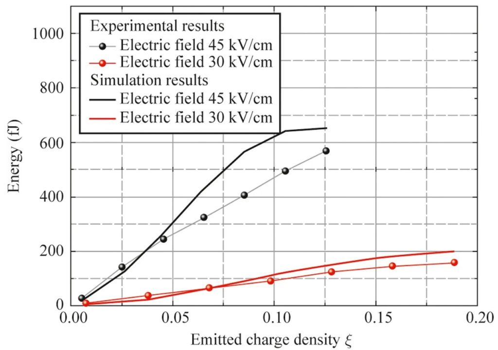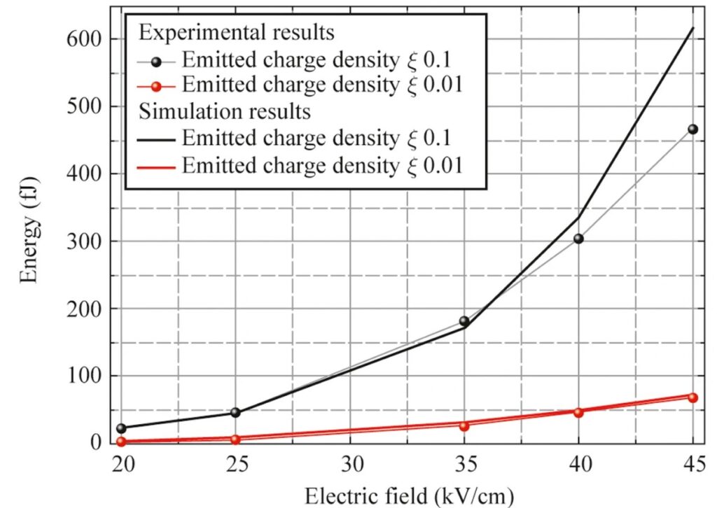 Наиболее важные параметры вакуумного фотодиода — приложенное внешнее электрическое поле и плотность излучаемого заряда. Поэтому исследователи построили зависимость энергии испускаемых импульсов и от них тоже. И в моделировании, и в эксперименте рост обоих параметров ведет к росту энергии терагерцового излучения.