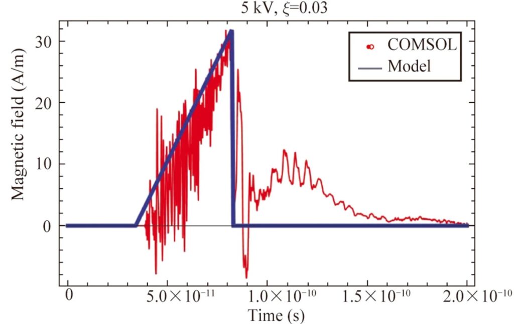Рисунок 2. Формы волн магнитного поля на основе полуаналитической модели и численного моделирования в COMSOL Multiphysics при отношении 0,03 испускаемой плотности заряда к запасенной на катоде и ускоряющем напряжении 5 киловольт. Источник: Frontiers of Optoelectronics