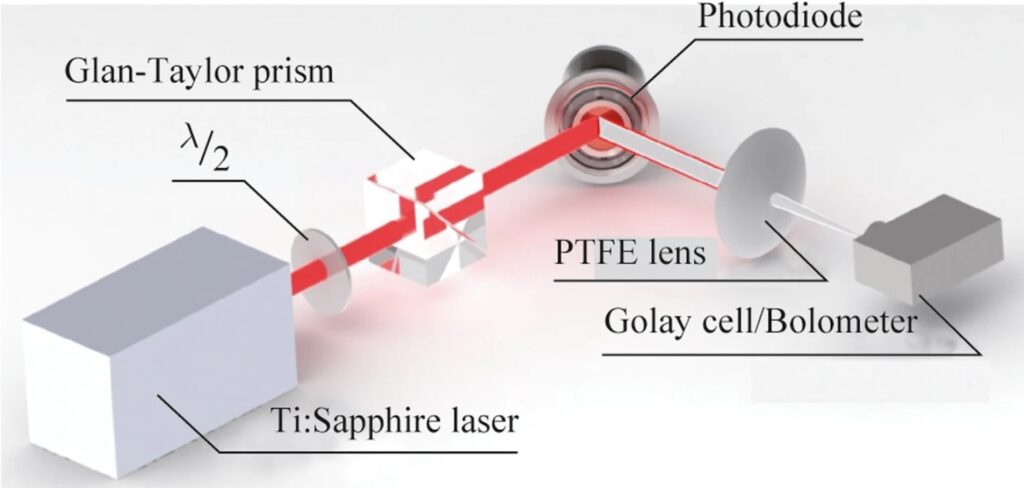 В эксперименте в качестве катода использовался медный диск с небольшим отверстием, а в качестве анода — кристаллический кварц с нанесенной на вакуумную сторону пленкой оксида индия и олова (ITO).Титан-сапфировый лазер испускает импульсное излучение, энергия и поляризация которого контролируется полуволновой пластинкой и призмой Глана — Тейлора. Этот луч попадает в вакуумный фотодиод, который испускает терагерцовые импульсы. Для сбора Т-излучения используется плосковыпуклая линза, изготовленная из политетрафторэтилена, которая фокусирует эти лучи и направляет их на измерительную систему (детектор).