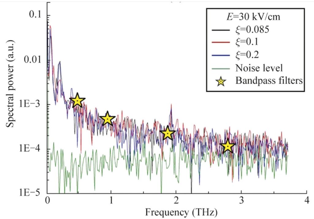 Рисунок 5. Экспериментально полученные спектры. Желтые звездочки соответствуют экспериментально полученным данным с использованием полосовых ТГц-фильтров. Источник: Frontiers of Optoelectronics