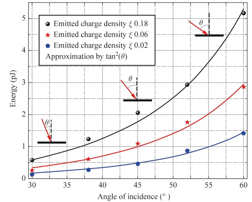 Рисунок 7. Зависимость энергии выходных импульсов от угла наклона лазерного луча, падающего на фотодиод. Непрерывные линии — функции аппроксимации, пропорциональные квадрату тангенса угла. Источник: Frontiers of Optoelectronics