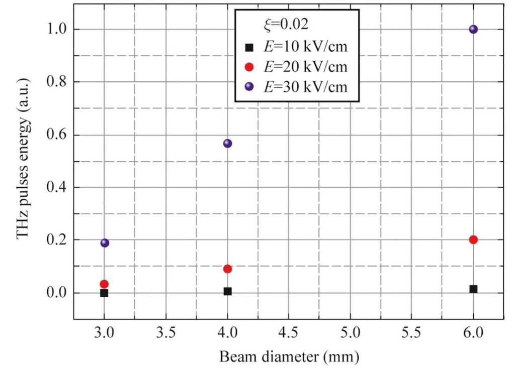 Максимальная энергия Т-лучей в этих экспериментах составила около 5,5 пДж. Также была измерена зависимость энергии импульсов от диаметра лазерного луча.