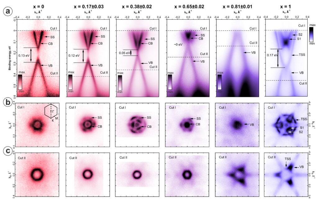 Рисунок. Электронная структура топологических изоляторов GexMn1-xBi2Te4, измеренная методом фотоэлектронной спектроскопии с угловым разрешением (ARPES) в зависимости от содержания германия х.