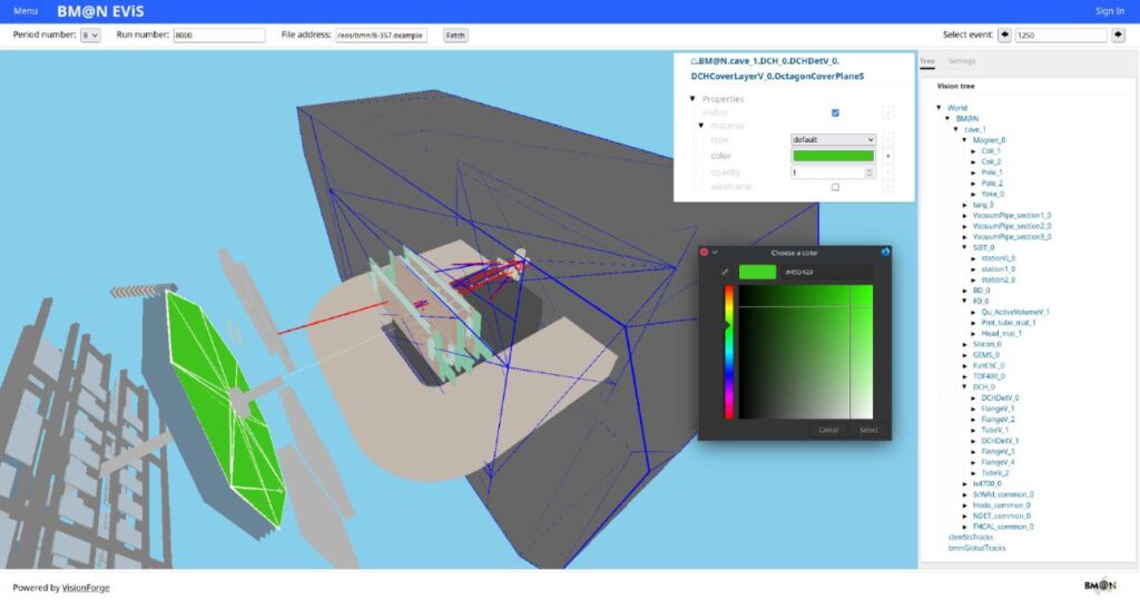 Решение, предложенное группой, основано на современной системе визуализации с открытым исходным кодом VisionForge, также разработанной сотрудниками Центра научного программирования ФПМИ МФТИ. Для его создания система VisionForge была интегрирована с программной платформой эксперимента BmnRoot, которая представляет собой среду на основе программного комплекса CERN ROOT.