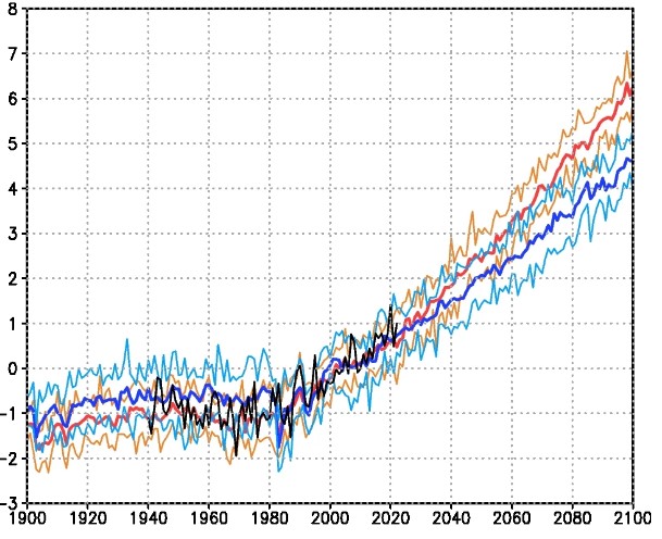 Рисунок 1. Годовое изменение приземной температуры в Северной Евразии по сравнению с 1995—2014 гг. для INMCM6 (красный), INMCM5 (синий). Оранжевые и голубые линии показывают диапазон значений модельного ансамбля. Источник: Climate Dynamics
