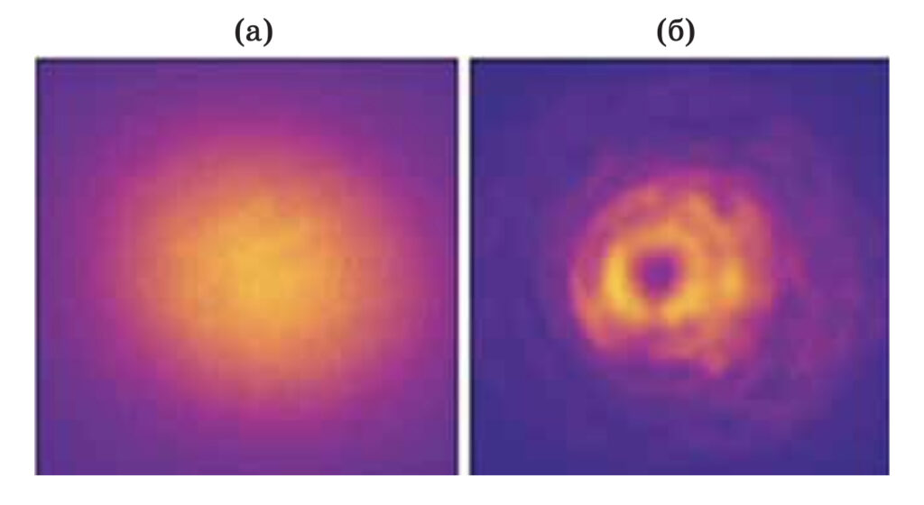 Рисунок 3. (а) Профиль пучка без использования метаповерхности. (б) Профиль пучка, прошедшего через метаповерхность. Темная область в центре соответствует фазовой сингулярности — области, где интенсивность света равна нулю. Источник: Оптический журнал