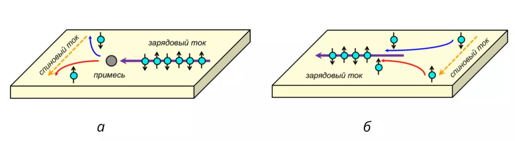 Рисунок 2. Иллюстрация прямого (а) и обратного (б) спинового эффекта Холла. Источник https://bigenc.ru/c/spinovyi-effekt-kholla-9b30af Александр Овчинников.