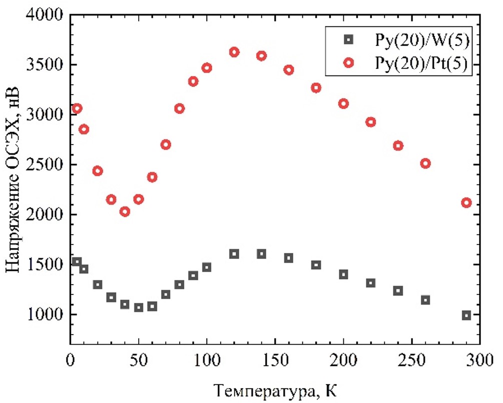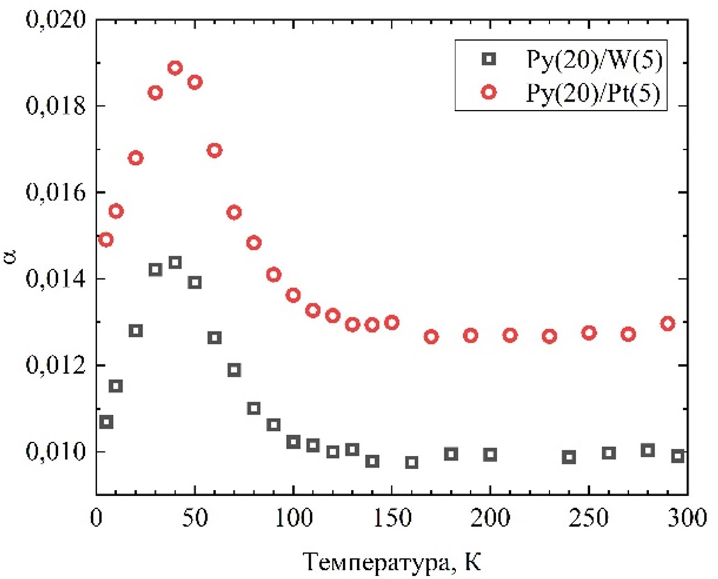 В работе российского коллектива ученых был проведен эксперимент по спиновой накачке в широком температурном диапазоне (5—300 К) для образцов гетероструктур пермаллоя(20 нм)/вольфрама(5 нм) и пермаллоя(20 нм)/платины(5 нм). Были определены значения параметра затухания Гильберта α и намагниченности насыщения для упомянутых выше структур. Также было измерено напряжение обратного спинового эффекта Холла в том же температурном диапазоне.