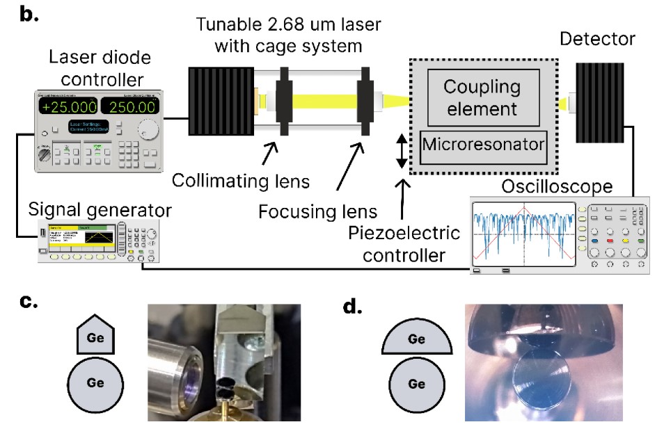 Рисунок 2. b. Схема экспериментальной установки для измерения добротности с различными элементами связи и микрорезонаторами; c. Германиевая призма, используемая в качестве элемента связи; d. Германиевая полусфера, используемая в качестве элемента связи. Источник: журнал Optics Express.