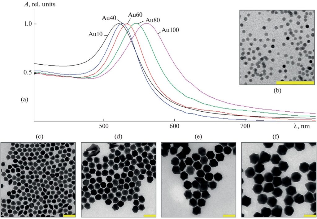 Рисунок 1. Спектры безразмерного коэффициента поглощения и изображения просвечивающей электронной микроскопии свежеприготовленных коллоидов наночастиц Au со средними размерами (b) 10, (c) 40, (d) 60, (e) 80 и (f) 100 нм. Масштабные линейки соответствуют 100 нм.