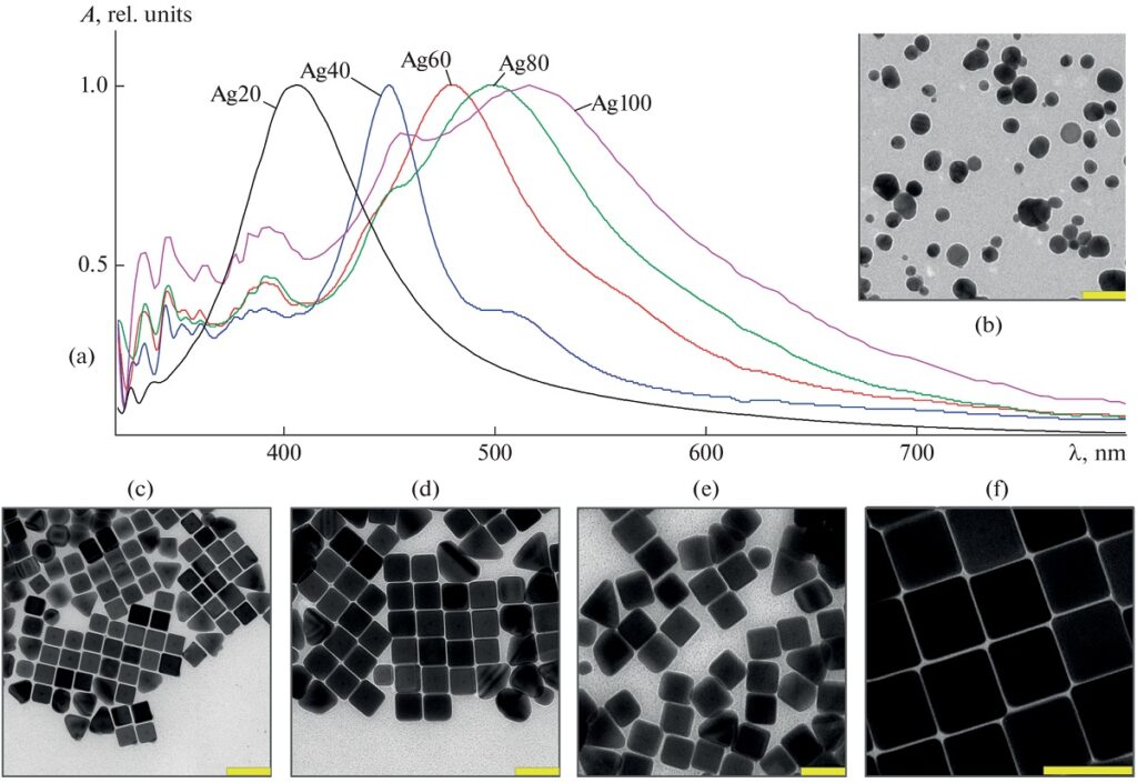 Рисунок 2. Спектры безразмерного коэффициента поглощения и изображения в просвечивающей электронной микроскопии свежеприготовленных коллоидов наночастиц Ag со средними размерами (б) 20 (по методу Леопольда–Лендла), (в) 40, (г) 60, (д)80 и (е) 100 нм. Масштабные линейки соответствуют 100 нм.