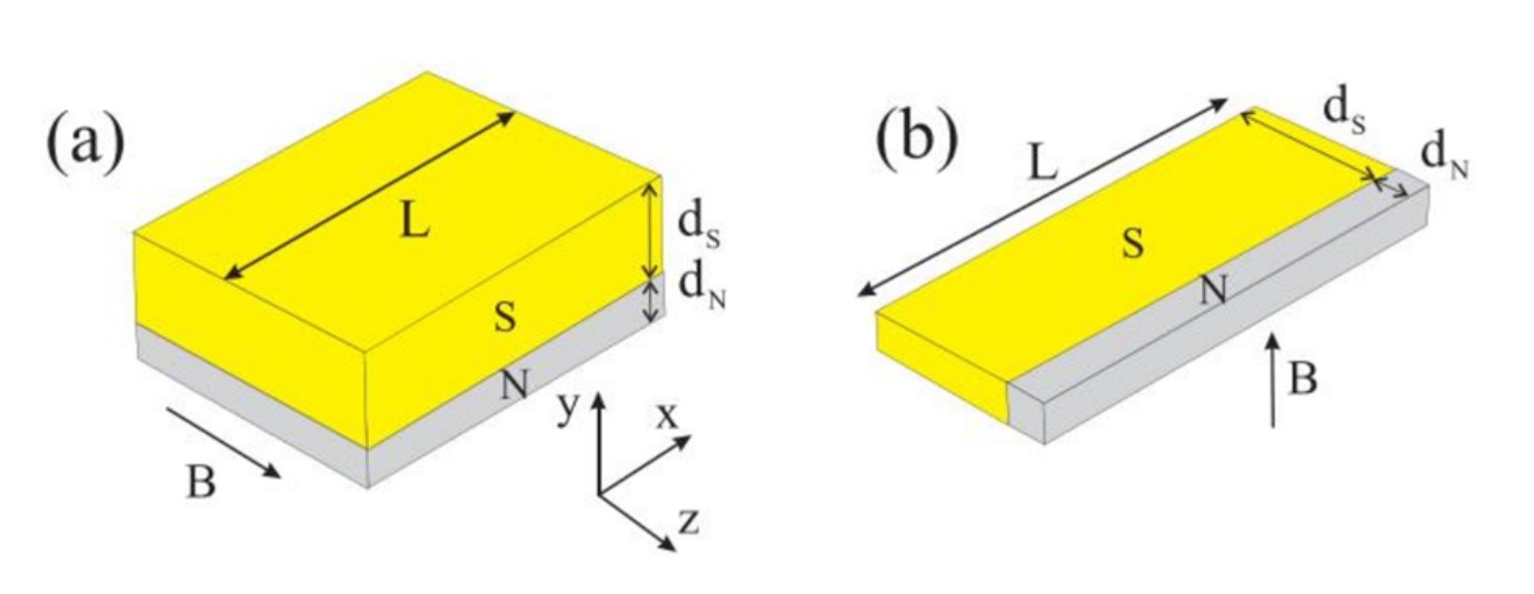 Рисунок 1. (а) Бислой сверхпроводник-нормальный металл конечной длины L в магнитном поле в плоскости. Нет зависимости сверхпроводящих свойств в направлении z . (б) Результаты должны быть применимы также к сверхпроводящей полосе конечной длины с областью N вблизи края, помещенной в магнитное поле вне плоскости. Источник Physical Review B.