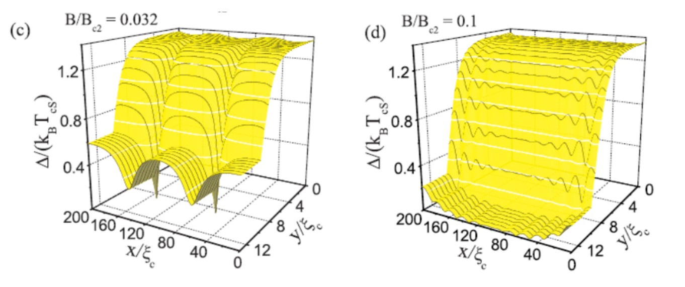 Рисунок 2. Пространственное изменение параметра порядка вдоль бислоя SN при различных магнитных полях. Минимумы в D(x,y) соответствуют расположению ядер вихрей при достаточно малых полях (B/Bc2 =0.032), тогда как при больших полях (B/Bc2=0.1) число минимумов больше числа вихрей, что говорит о появлении предвихревого, пространственно-модулированного состояния. Источник Physical Review B.