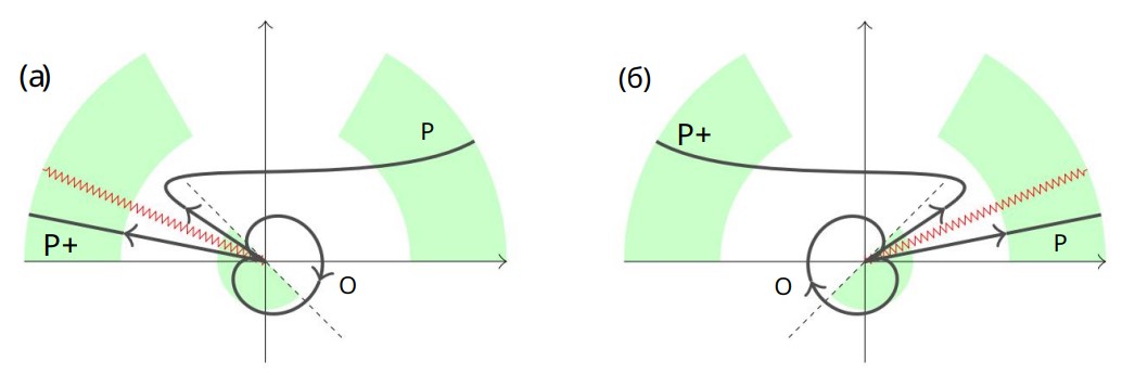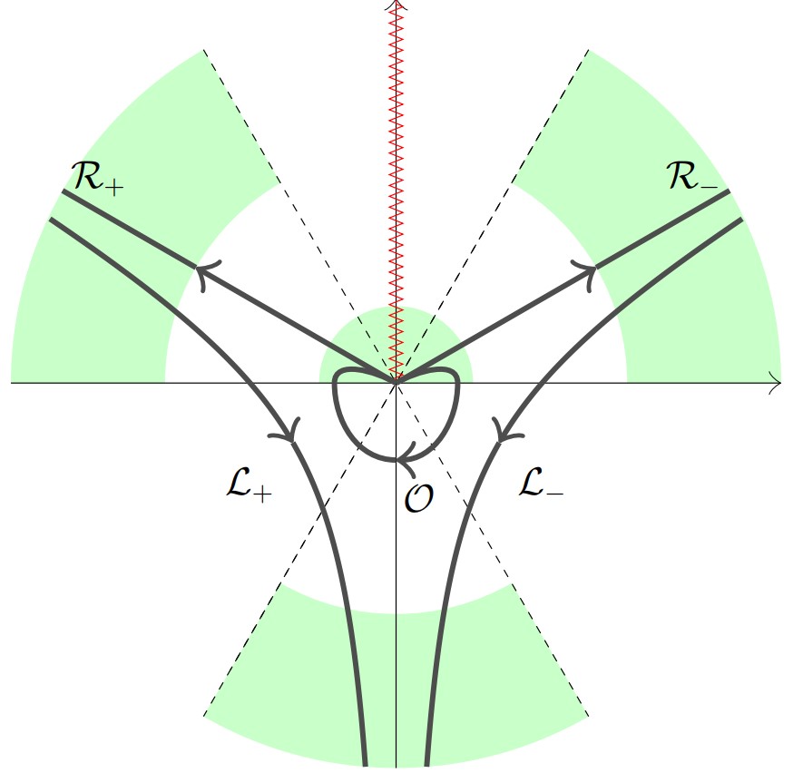 Рисунок 1. Схема контуров для представлений функций Эйри со сдвинутыми друг относительно друга аргументами. Волнистая линия обозначает ветвь разреза в комплексной плоскости k. Сплошные линии обозначают контуры интегрирования. Цветные области показывают внутренние и асимптотические долины. Ветвь разреза, контуры R± и O, а также внутренняя долина соответствуют случаю arg z0 = 0. Источник: Zeitschrift für angewandte Mathematik und Physik.