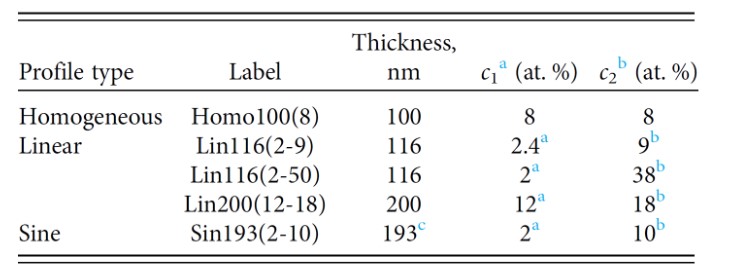 Рисунок 3. Параметры изготовленных пленок. Примечания: (а) — минимальная концентрация железа, (b) — максимальная концентрация железа, (с) — период профиля одной пленки, в которой концентрация атомов железа определялась законом синуса. Источник: Journal of Vacuum Science & Technology A.
