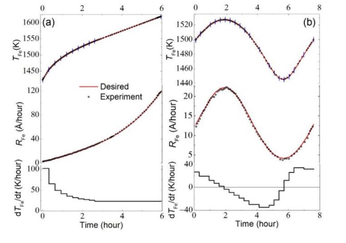 Рисунок 4. (а) Температура термопары ячейки с железом, скорость осаждения железа и зависимость скорости нагрева/охлаждения от времени для Lin116(2-50) и (b) — для образцов Sin193(2-10). Источник: Journal of Vacuum Science & Technology A.