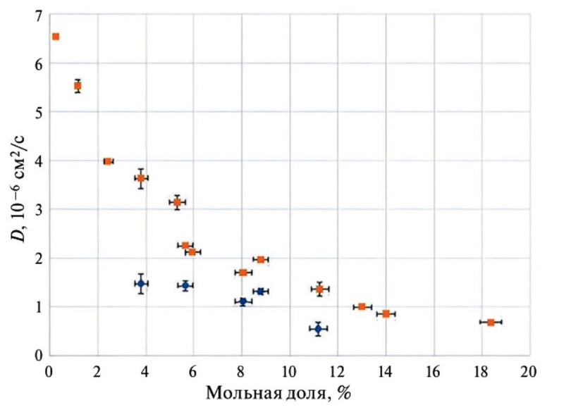 Зависимость величин коэффициентов диффузии D1 и D2 от мольной доли линейных молекул полиэтиленгликоля, растворенных в дейтерохлороформе. Источник: Fluid Dynamics.
