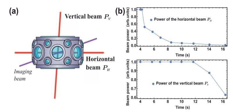 Рисунок 1. a) Схема направления лучей дипольной оптической ловушки. Красные линии показывают горизонтальные и вертикальные лучи; фиолетовая линия показывает зондирующий луч для визуализации поглощения. b) Испарение атомов для образования конденсата. Синие точки обозначают значения мощности лучей, которые были заданы в качестве входных параметров для оптимизатора. Источник: Physical Review A.