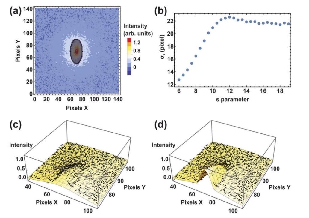 Рисунок 2. Аппроксимация атомного облака. а) Плотность атомного облака с наличием БЭК. б) Маска для разделения теплового облака и конденсата. с) 3D-график подгонки теплового облака, d) 3D-график решения уравнения Томаса-Ферми для описания теплового облака. Источник: Physical Review A.