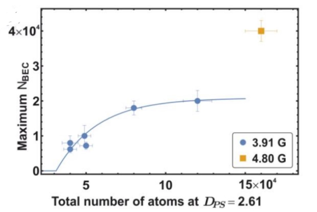 Рисунок 3. По горизонтальной оси отложено общее число атомов в подкритической фазе перед образованием конденсата, по вертикальной — в самом конденсате. Сначала оптимизировали процесс при магнитном поле величины 3,91 Гс, затем обнаружили, что при тех же параметрах в поле 4,8 Гс можно достичь значительно большего числа атомов. Источник: Physical Review A.