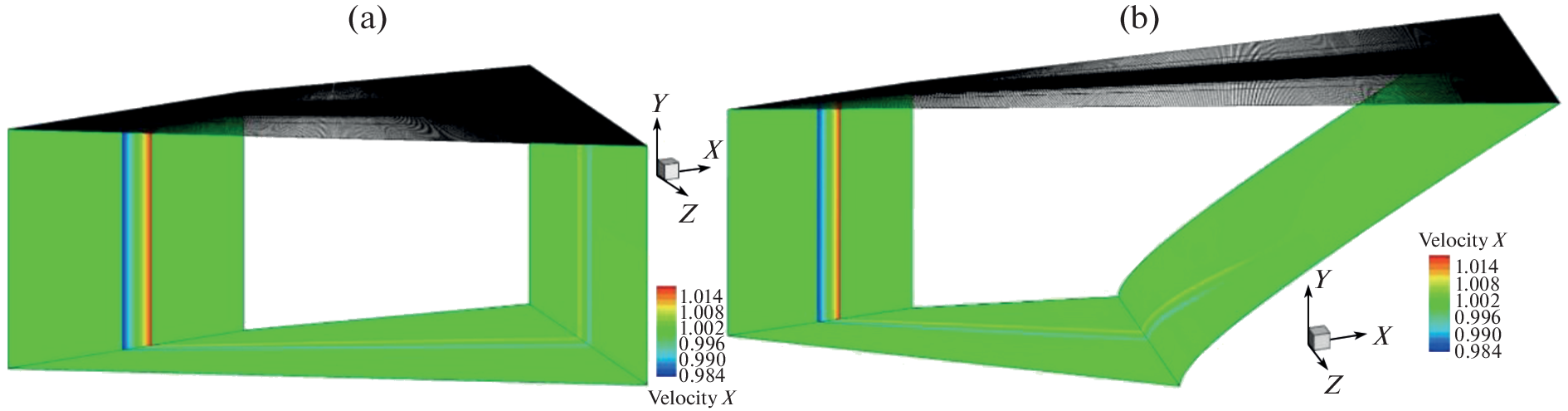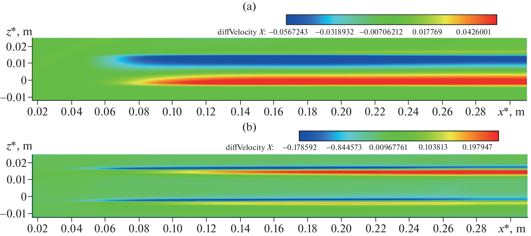 Рисунок 3. Возмущение продольной составляющей скорости в поперечном сечении y = 0,0033 м: острая (а) и тупая (b) пластины. Источник: журнал Fluid Dynamics.