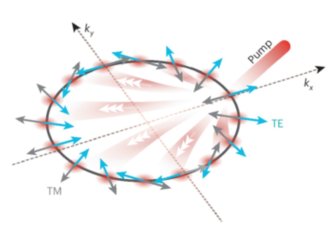 Рисунок 1. Иллюстрация оптического спинового эффекта Холла, предсказанного теоретически А. В. Кавокиным, М. М. Глазовым и Г. Мальпешем в 2005 году. Кольцеобразное распределение поляритонов по скоростям, генерируемое линейно поляризованным резонансным лазерным пучком (красная линия) и распределение магнитного поля, вызванное расщеплением электромагнитных мод TE–TM (синие и серые стрелки соответственно). Эффективное магнитное поле действует на экситонные поляритоны, создавая сильный спиновый ток. Источник: журнал Nature Materials.