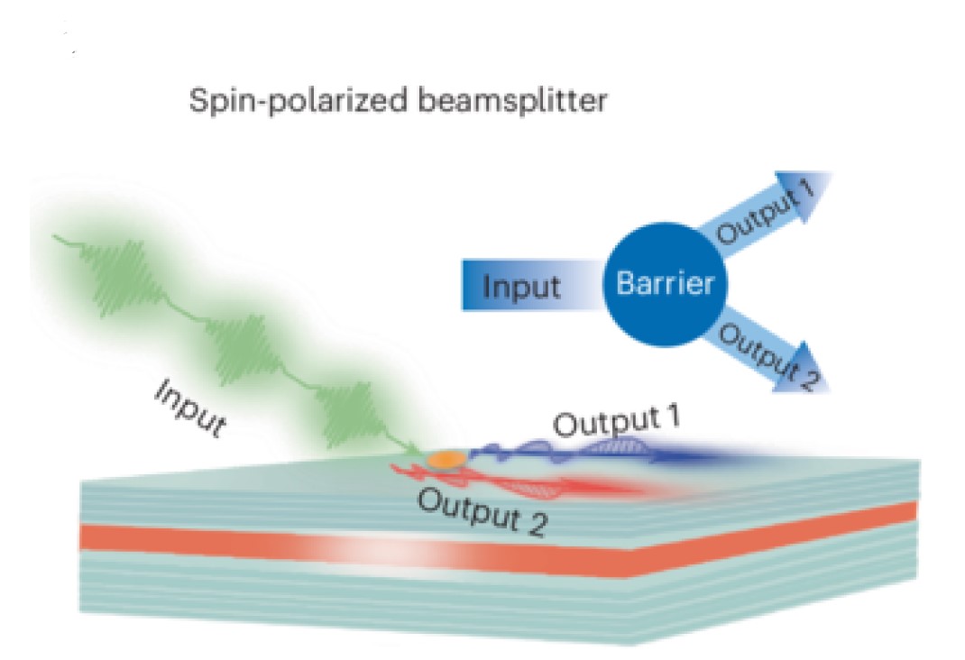 Рисунок 3. Схема спин-поляризованного светоделителя. Когда линейно поляризованный входной луч попадает в микрополость, он разделяется на два луча с противоположными спинами. Разделение происходит за счет рассеяния поляритона на потенциальном барьере, образованном узлом кристаллической решетки или специально введенными примесями. Источник: журнал Nature Materials.