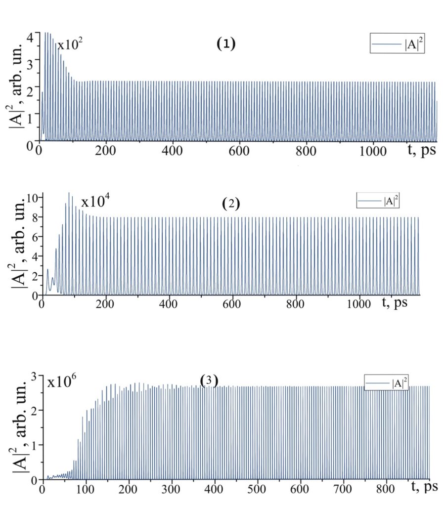 Еще были были получены результаты генерации лазерных импульсов в ИК-диапазоне для двух случаев, основное отличие которых заключалось в небольшой разнице времени релаксации инверсии. Это время, за которое система возвращается в термодинамическое равновесие после внешнего воздействия. Оказалось, что небольшое различие приводит к значительной разнице между длительностью импульсов. Расчет показал, что длительность импульса составляет 1,72 пс и 0,28 пс для большего и меньшего значения времени инверсии соответственно. Более того, в случае более длительного импульса режим работы лазера соответствует одномодовому режиму, а короткого — двухмодовому, т. е. происходит генерация двух импульсов разной частоты за время полного обхода лазера. Таким образом, за счет небольшого изменения времени релаксации инверсии можно менять режим работы лазера.