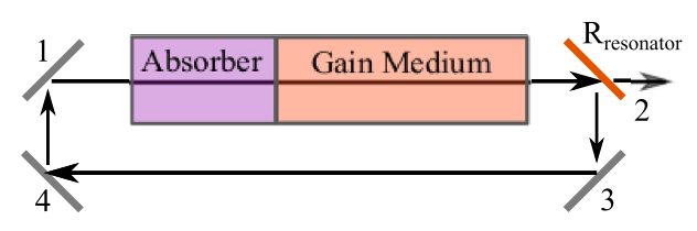 Схематичное изображение модели лазера. 1—4 зеркала кольцевого резонатора, absorber — поглощающая среда, gain medium — усиливающая среда. Источник: журнал Applied Physics B.