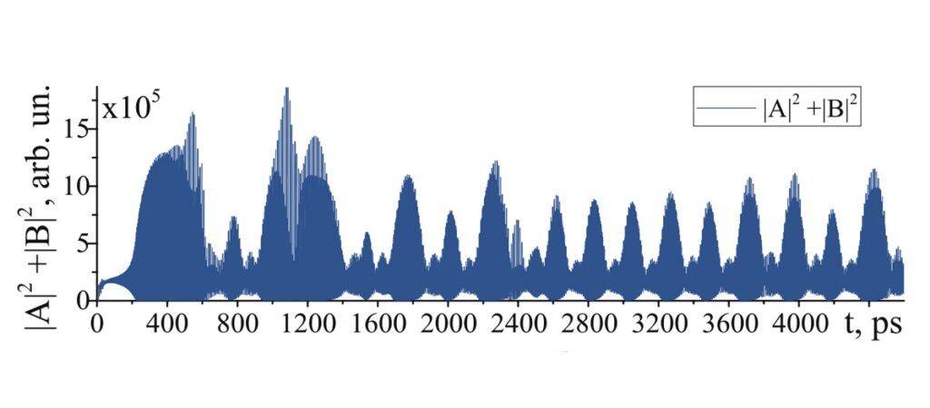 «При учете расстройки мы получили генерацию в виде серий импульсных пачек, каждая из которых длится примерно 140 пс и содержит 40—45 отдельных импульсов, что отчетливо видно после отметки 1,6 нс. Их длительность составляет около 0,5 пс», — рассказал Рустам Хабибуллин.