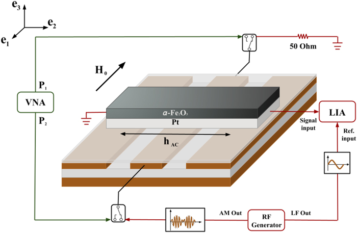 Рисунок 2. Экспериментальная установка для измерения квазиферромагнитного резонанса (зеленая) и спиновой накачки (красная). Источник Journal of Applied Physics.