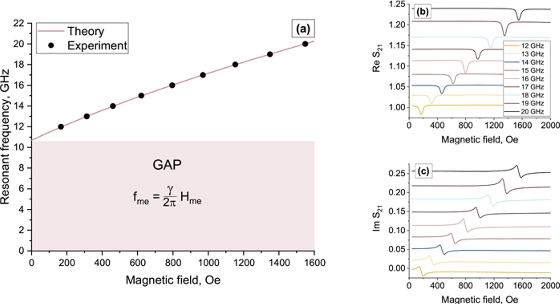 Рисунок 3. (а) Теоретические и экспериментальные зависимости резонансной частоты от магнитного поля гематита. Щель в энергетическом спектре при нулевом магнитном поле определяется полем спонтанной магнитострикции. (b) Действительная и (c) мнимая части коэффициента передачи мощности на разных частотах. Источник Journal of Applied Physics.