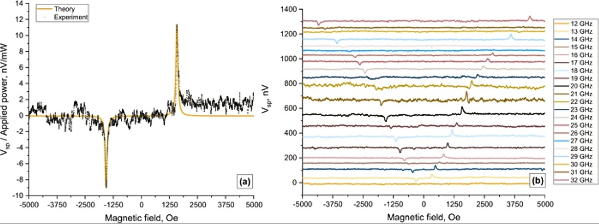 Рисунок 4. (а) Сравнение теоретической кривой с экспериментальными данными спинового напряжения Vsp на частоте 20 ГГц, нормированного на входную мощность. (б) Набор экспериментальных зависимостей выходного напряжения, вызванного обратным спиновым эффектом Холла, на различных частотах. Источник Journal of Applied Physics.