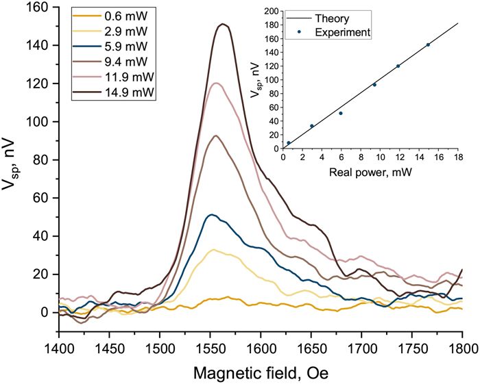 Рисунок 5. Экспериментально измеренная зависимость выходного напряжения Vsp от величины внешнего магнитного поля для различных мощностей входного сигнала на частоте 20 ГГц. На вставке показаны теоретическая и экспериментально измеренная зависимости выходного напряжения от мощности входного сигнала на частоте 20 ГГц. Источник Journal of Applied Physics.