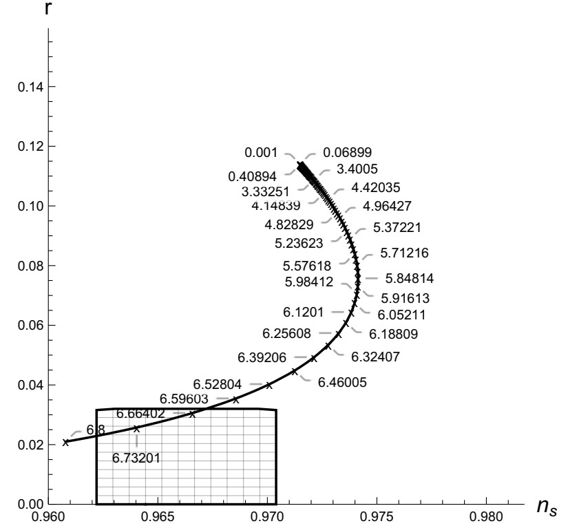 Рисунок 1. Инфляционные параметры для случая N = 70 раз расширений в e раз. Маркеры графика соответствуют различным значениям массы m, оцененным в безразмерных единицах. Штриховка отмечает область, которая согласуется с данными наблюдений. Источник: журнал Physics of Particles and Nuclei Letters.