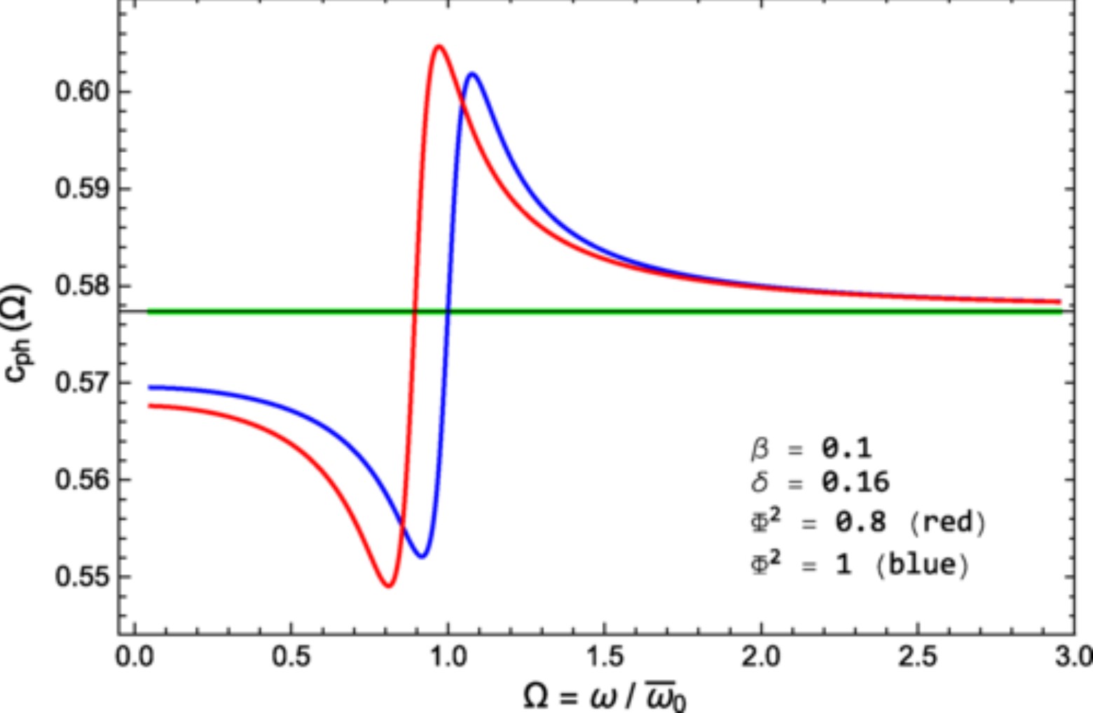 Рисунок 1. Скорость звука в пузырьковой HNS как функция Ωв 𝛽 = 0,1, 𝛿 = 0,16. Красная линия соответствует Ф2 = 0,8, а синяя линия — Ф2 = 1. Зеленая линия — скорость звука без пузырьков. Источник: Physical Review D .