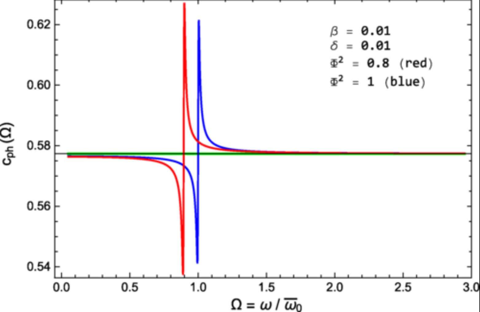 Рисунок 2. Скорость звука в пузырьковой HNS как функция Ωв 𝛽 = 0,01, 𝛿 = 0,01. Красная линия соответствует Ф2 = 0,8, а синяя линия — Ф2 = 1. Зеленая линия — скорость звука без пузырьков. Источник: Physical Review D .