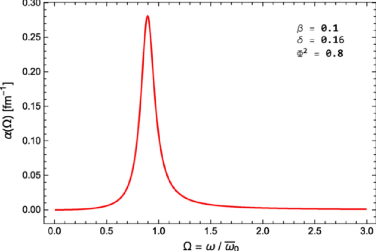 Рисунок 3. Затухание звука как функция Ωв при Ф2 = 0,8, 𝛽 = 0,1 и 𝛿 = 0,16. Резонанс смещен влево от Ωв = 1 из-за затухания. Источник: Physical Review D .