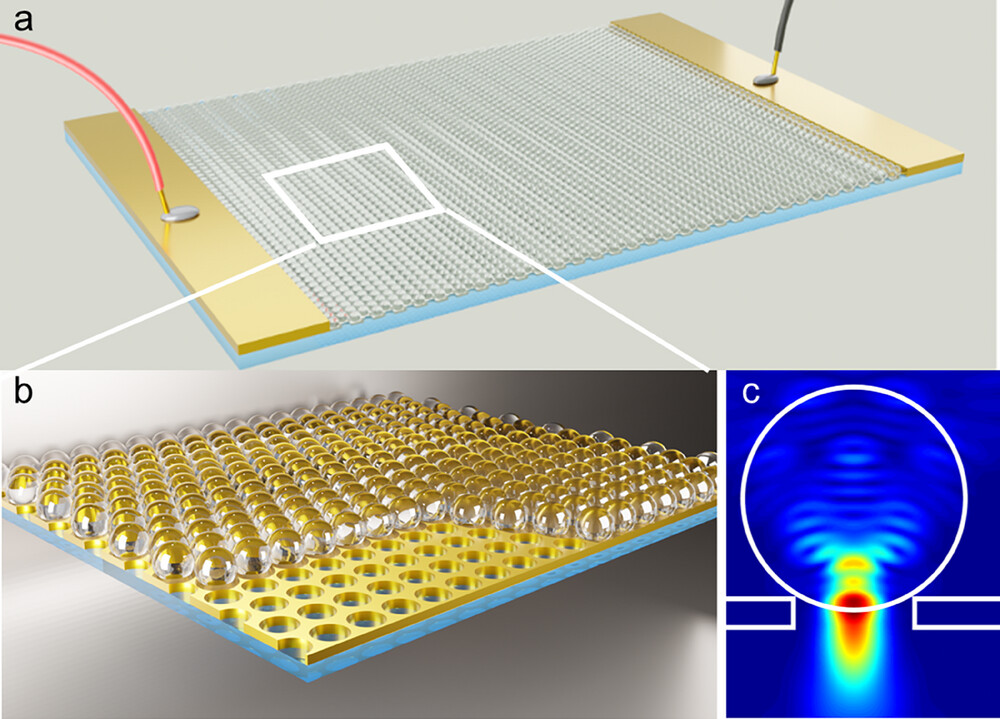 (a) Схема метаматериала с электродами. (b) Увеличенный фрагмент поверхности, несколько микросфер были удалены, чтобы показать конструкцию структурированного металлического слоя. (c) Принцип работы фотонного нано-джета, обеспечивающий эффективное пропускание света через металлическую апертуру. Источник: Laser and Photonics Reviews.