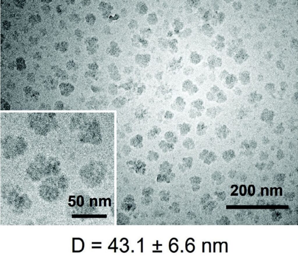 Рисунок 1. Изображение конъюгантов, наночастицы фитогликогена — углеродные квантовые точки, полученное методом криогенной просвечивающей электронной микроскопии. Источник: Advanced Functional Materials.