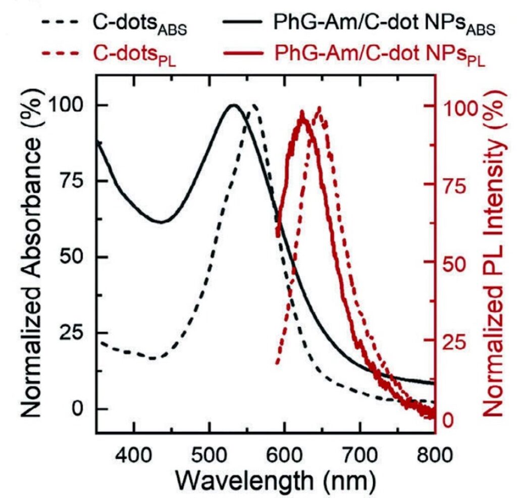 Рисунок 2. Спектры поглощения (черный цвет) и фотолюминесценции (красный цвет) углеродных квантовых точек (пунктирная линия) и конъюгантов, наночастицы фитогликогена — углеродные квантовые точки (сплошная линия). Источник: Advanced Functional Materials.