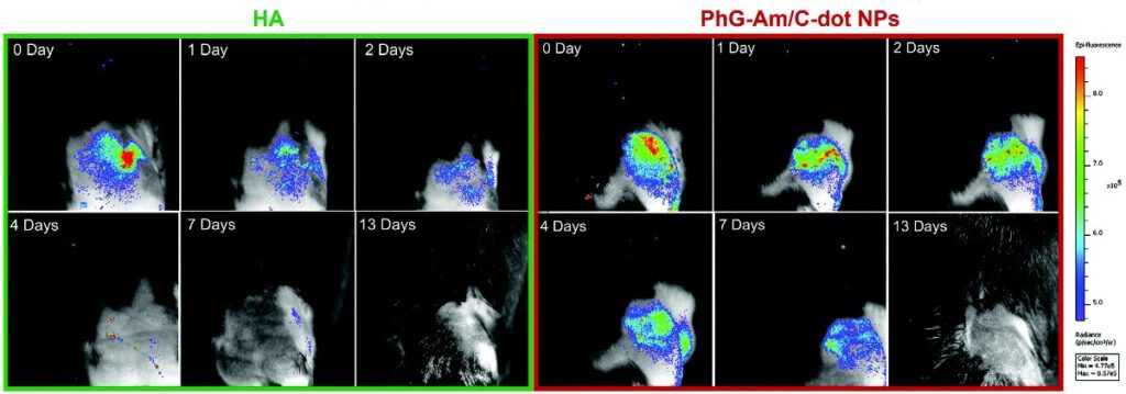Рисунок 3. Изображения коленных суставов мышей после внутрисуставной инъекции препаратом на основе: гиалуроната натрия (слева, в зеленой рамке) и конъюгантов, наночастицы фитогликогена — углеродные квантовые точки (справа, в красной рамке). Источник: Advanced Functional Materials.