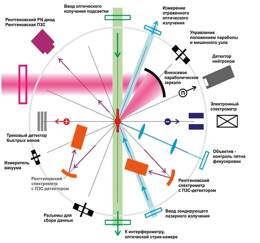 Созданная в АО «ЦНИИмаш» лазерная установка стала экспериментальной основой работ в институте по лабораторной астрофизике. Эксперименты проводились с 10-ти тераваттным уровнем мощности при следующих параметрах лазерного импульса: энергия до 15 Дж, длина волны 1.055 мкм, длительность 1,0 пикосекунды, контраст лазерного излучения порядка 10^8. Система фокусировки на основе внеосевого параболического зеркала с фокусным расстоянием 20 см обеспечивала концентрацию не менее 40 % энергии лазерного пучка в пятно диаметром 10 мкм и пиковую интенсивность излучения порядка 5 × 10^18 Вт/см2. При воздействии такого мультитераваттного лазерного излучения на вещество возникает плазма с уникальными параметрами — температурой ионов порядка миллиарда кельвинов, энергией протонов уровня мегаэлектронвольт (106 эВ), магнитным полем более ста мегагаусс (10^8 Гс) и соответствующим давлением порядка сотен миллионов атмосфер.