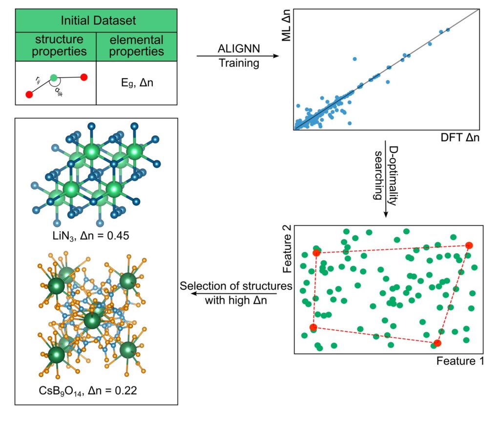 Одной из таких архитектур, которая сочетает в себе описанные выше свойства, является графовая нейронная сеть. В этом исследовании в качестве основного инструмента использовалась модель графовой нейронной сети ALIGNN. Исследователи обучили ее предсказывать величину двулучепреломления материала, основываясь на кристаллических структурах. Для определения точности предсказании физики добавили критерий D-оптимальности. Этот критерий показывает, насколько надежны предсказания модели на новых данных. Он также оценивает, насколько хорошо характеристики новых материалов «вписываются» в набор данных, использованный для обучения модели.