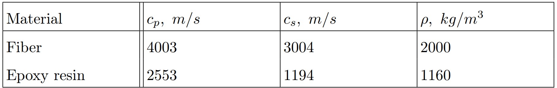Метод был применен для исследования распространения ультразвуковых волн в композитном материале, состоящем из восьми слоев цилиндрических волокон, расположенных под разными углами и залитых эпоксидной смолой. Цилиндрические волокна имеют радиус 0,1 мм. Физические размеры области моделирования составляют 1 см x 1 см x 2 мм. Расчетная сетка поддерживает размер шага 0,001 мм, и хотя криволинейные сетки вносят искажения, изменение шага не превышает 1,5 раза от фоновой сетки. Принятое временное разрешение составляло временной шаг в одну наносекунду, а общее моделируемое время составило одну микросекунду.